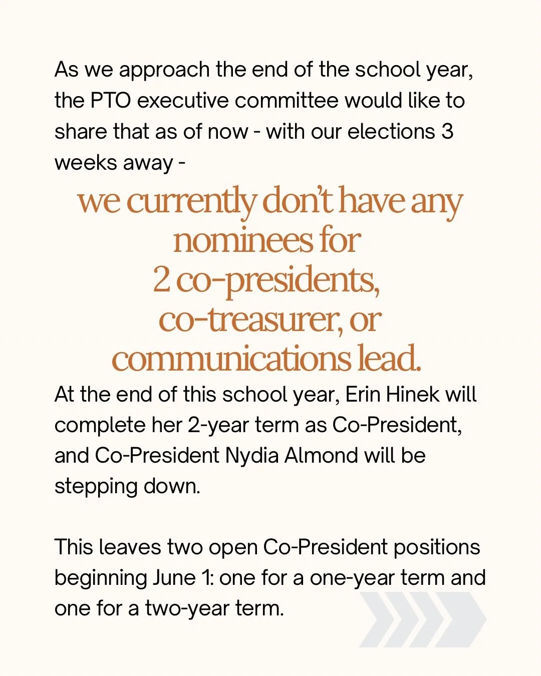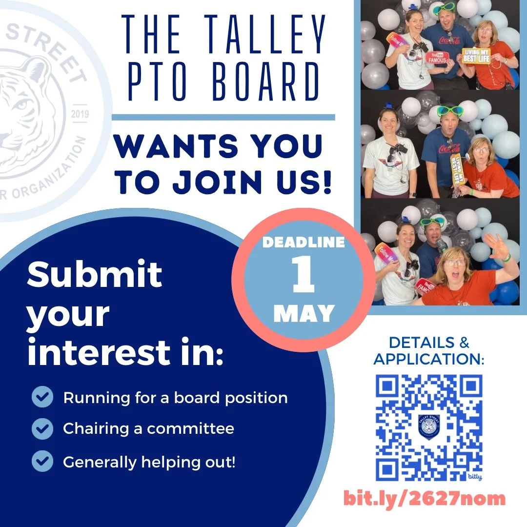 It’s PTO election season and we want you to join us next year. The Talley PTO has a voting board of 14 to 17 people and an even larger group of committee chairs and members. There are positions large and small and we need volunteers for them all.